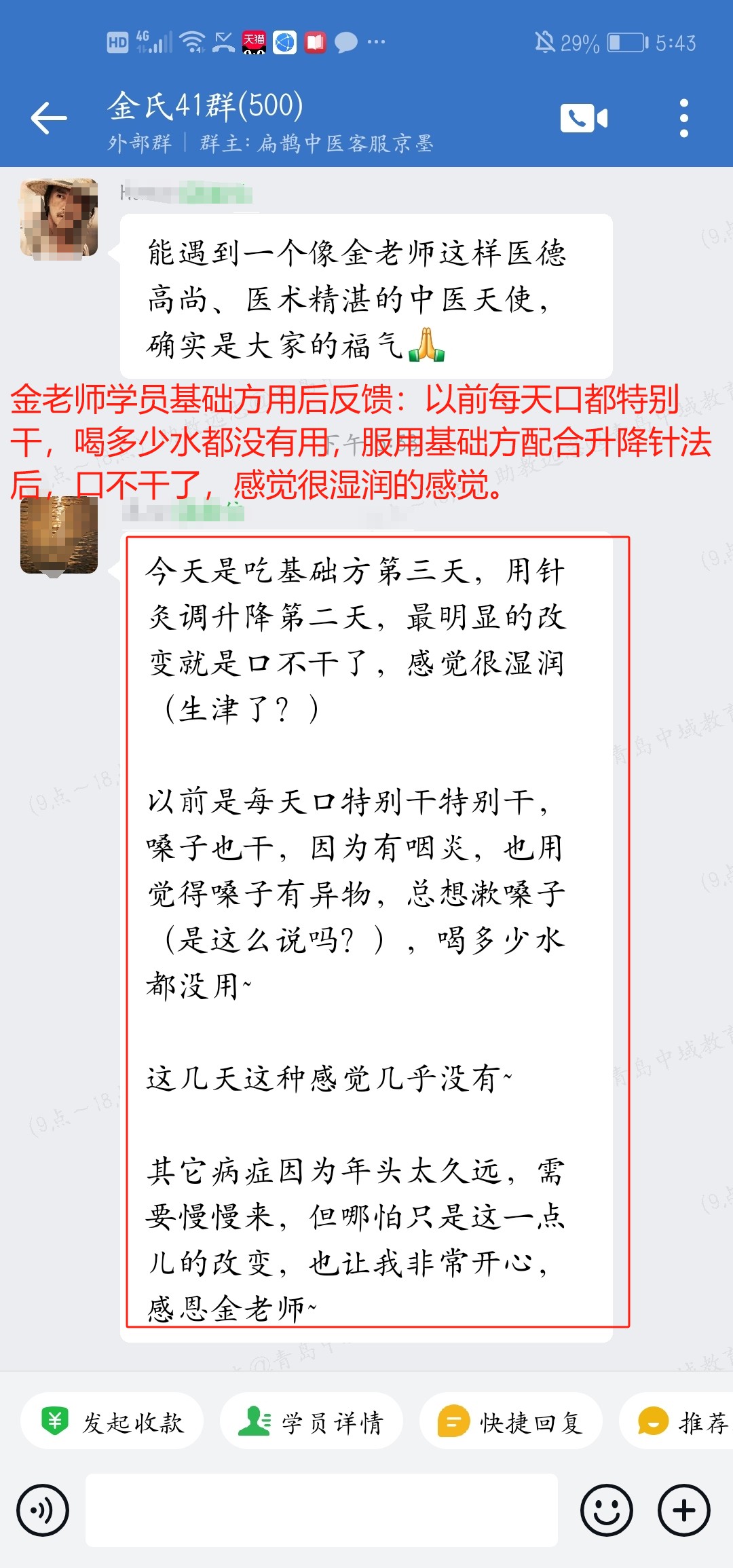 以前每天口都特别干,喝多少水都没有用,服用基础方配合升降针法后,口不干了,感觉很湿润的感觉。