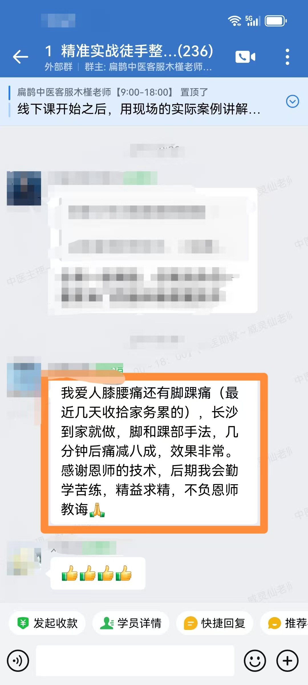 学员运用张老师手法调理家属膝腰痛、脚踝痛。几分钟后缓解八成,后期勤学苦练、精益求精!!