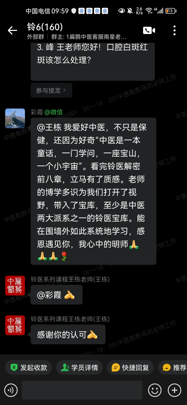 我爱好中医,不只是保健,还因为好奇“中医是一本童话,一门学问,一座宝山,一个小宇宙”。看完铃医解密前八章,立马有了质感。老师的博学多识为我们打开了视野,带入了宝库,至少是中医两大派系之一的铃医宝库。能在围墙外如此系统地学习,感恩遇见你,我心中的明师。